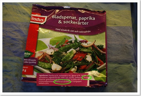 Ibland måste man ta genvägar vid middagstid, eller så orkar man helt enkelt inte anstränga sig så mycket. Då är det ju praktiskt att det finns vettiga halvfabrikat. Som Findus nya grönsaksblandningar, bara svenskproducerade grönsaker rakt av utan tillsatser – trodde jag. Visst är de goda och praktiska, men VARFÖR är det druvsocker i grönsakerna? Brukar man ha socker i grönsaksrätter kanske? Honung har man väl stött på nån gång, men socker?
